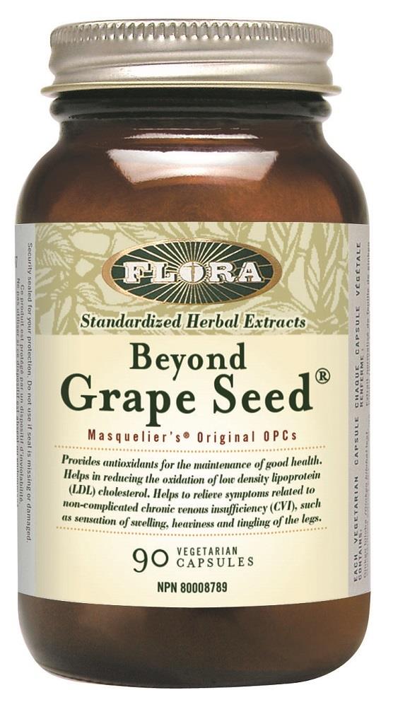 Over fifty years ago in the Bordeaux region of France, Dr Jacques Masquelier made one of the most signifi cant discoveries in nutritional science He isolated a powerful antioxidant, cell and tissue protector, known today as Oligomeric Proanthocyanidins (OPCs) Flora has formulated Beyond Grape Seed® by blending Masquelier’s® original OPCs with a full spectrum of biofl avonoids from bilberries and cranberries Beyond Grape Seed® helps avert premature aging by blocking destructive enzymes and reducing free radical-induced weakening of collagen, an essential and major component of skin, muscles, tendons and ligaments OPCs do this by donating electrons to unstable free radicals to neutralize them without the danger of becoming unstable themselves OPCs offer protection to collagen and at the same time support the body’s ability to maintain and enhance the health of connective tissue and the elasticity of skin The OPCs in Beyond Grape Seed® help strengthen the entire capillary system, preventing leakage from vessels in the legs, eyes and skin into surrounding tissue OPCs also help repair and prevent arterial lesions, keeping the blood vessel walls smooth, which helps prevent plaque build-up, as cholesterol can no longer become trapped.