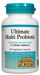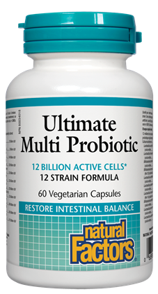 Probiotic supplementation provides live microorganisms that temporarily modify gut flora, helping to maintain natural intestinal balance, improve digestion and immunity. Natural Factors Ultimate Multi Probiotic contains active cells of a blend of specially cultured strains of probiotics, chosen for their compatibility and ability to survive stomach acidity.