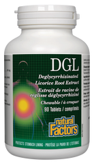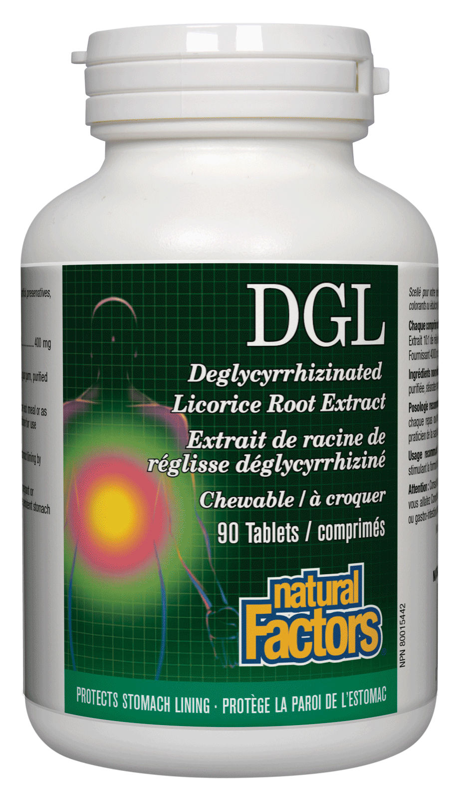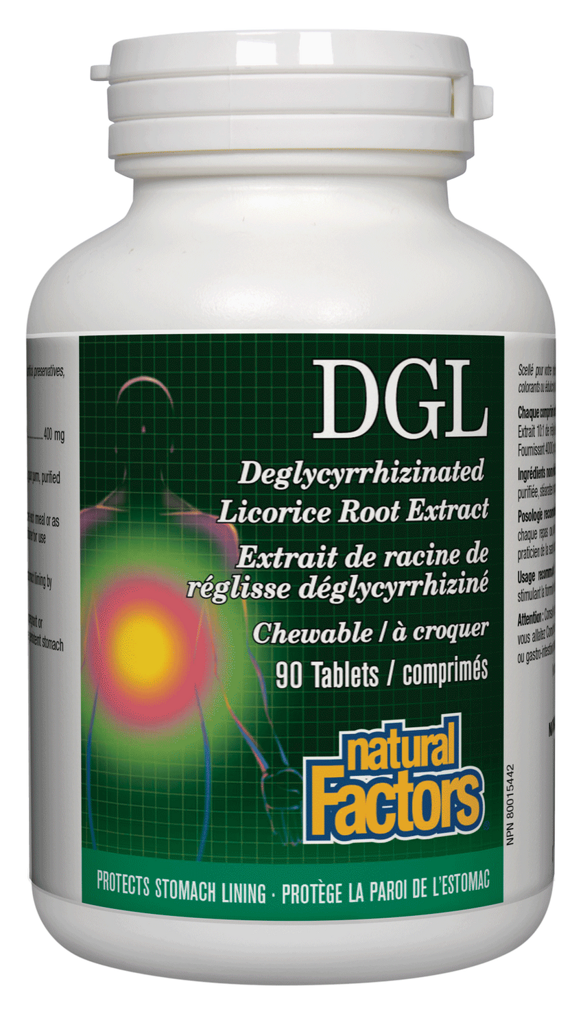 Natural Factors DGL NPN 80015442 Natural Factors DGL (Deglycyrrhizinated Licorice Root) Extract 400 mg stimulates and/or accelerates the factors that protect against and heal ulcers and increase the production of mucin (the protective coating in the stomach and intestines.) DGL has also been shown to protect against H.pylori, aids in deigestion,...