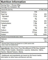 Ingredients: Ultra Cross Flow Microfiltered (CFM) New Zealand Whey Protein Isolate, Inulin (Chicory Root), L-Glutamine, L-Leucine, L-Isoleucine, L-Valine, Natural Flavours, Stevia.